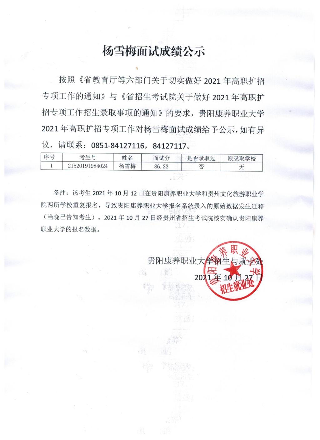 taptap点点2021年高职扩招专项工作对杨雪梅面试成绩的公示