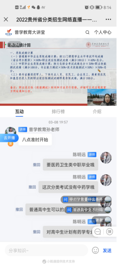 2022年3月8日晚上8:00,学校党委委员、副院长杨虹参加由贵阳日报传媒集团新媒体运营中心联合贵州普学教育科技有限公司共同主办的“2022 年贵州省分类招生线上巡展”直播。本次直播同步zaker直播、百度直播、今日头条直播等多个平台,约17000多人观看。