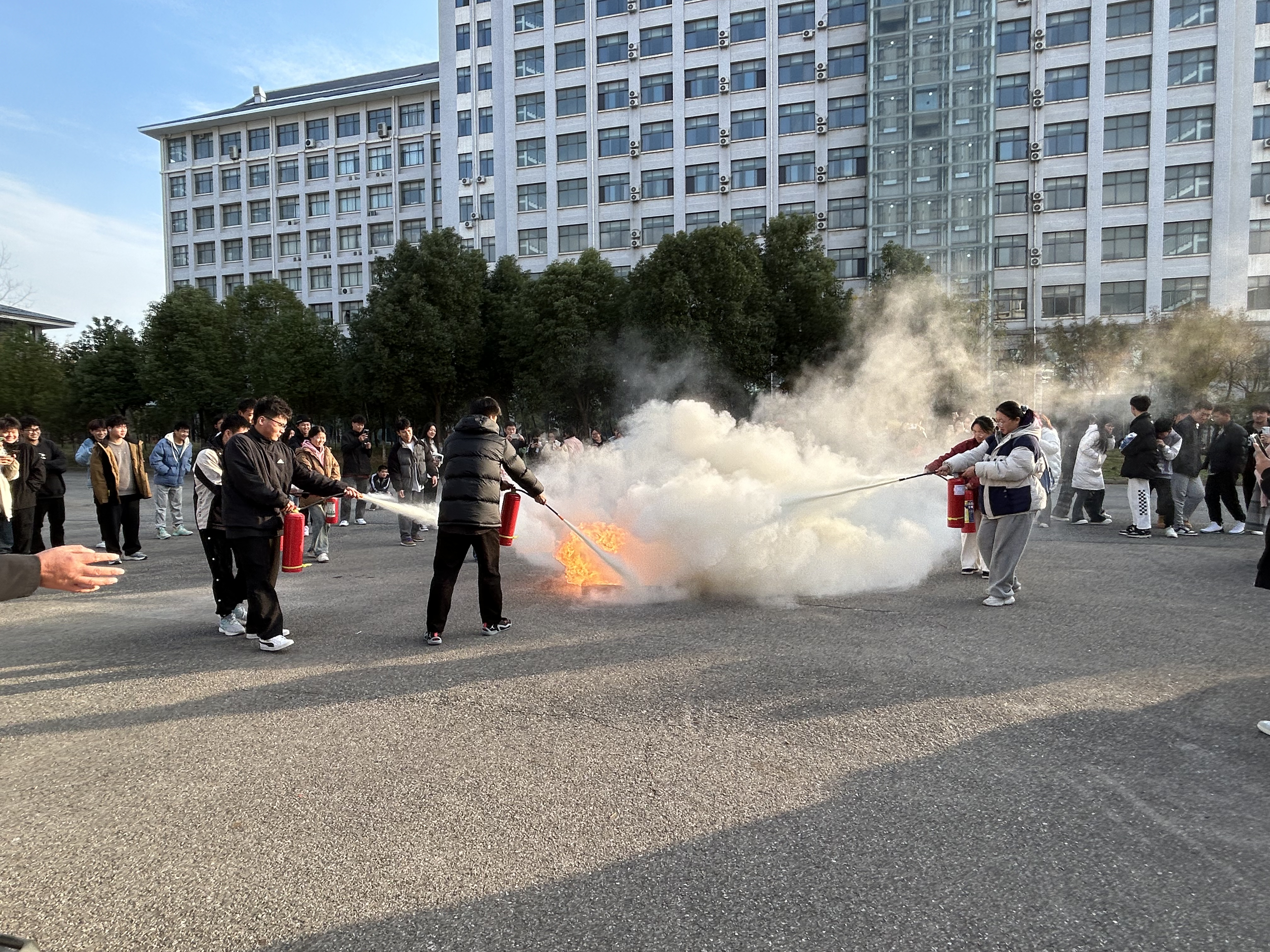 接着开展了消防应急疏散演练和灭火实操演练。现场演练发现火情、报告火情、参与灭火及人员疏散等环节。在灭火现场,吴科长和消防科的其他老师们详解教授同学们如何使用灭火装置,指导在场同学们进行了消防火灾实战演练,强化同学们扑救火灾的技能。