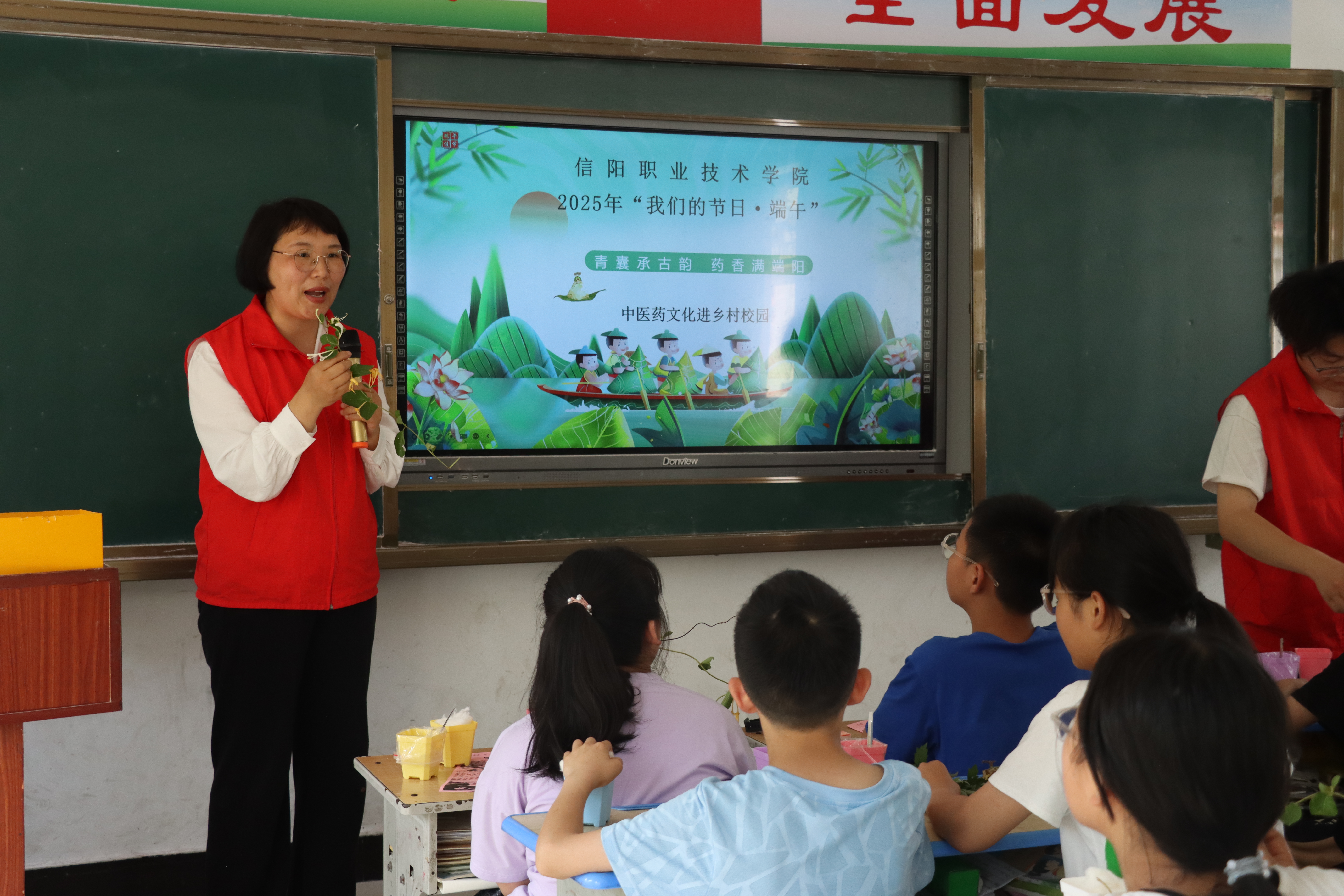 在百战坪小学,团队志愿者以趣味讲座、互动问答和实物展示的形式向老区留守儿童普及中医药基础知识。志愿者先讲述了《神农尝百草》的故事,介绍“药食同源”的生活智慧,接着展示各类中药材标本,详细介绍艾草、金银花等大别山道地药材的功效、形状和气味,,让小学生感受到中医药文化的博大精深。现场还发放了团队自制的中医药趣味宣传页,引发了同学们对中医药的浓厚兴趣。