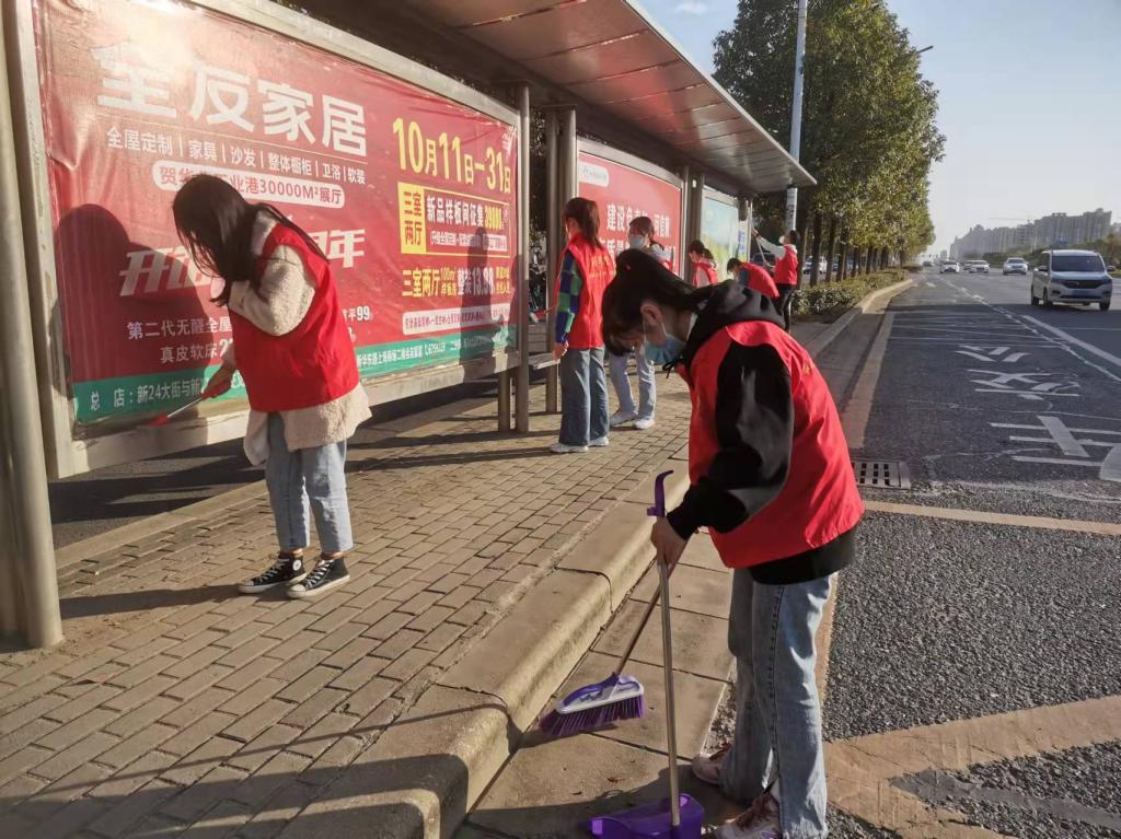 11月12日下午,在党总支副书记、学工支部书记李光霞带领学生发展对象和入党积极分子志愿者对学校周边的公交站台进行清扫。活动中,志愿者们带着水桶、抹布、扫帚、拖把等工具,仔细擦拭公交站牌及候车座椅的上的灰尘、污渍和小广告,并把站台周边的绿化带清扫一遍。在志愿者们认真地劳动下,公交站台的座椅和标识牌焕然一新,地面以及绿化带周围的垃圾也清理一空,顿时洁净优美,路过的市民和乘客们都纷纷给予赞许的微笑和目光。