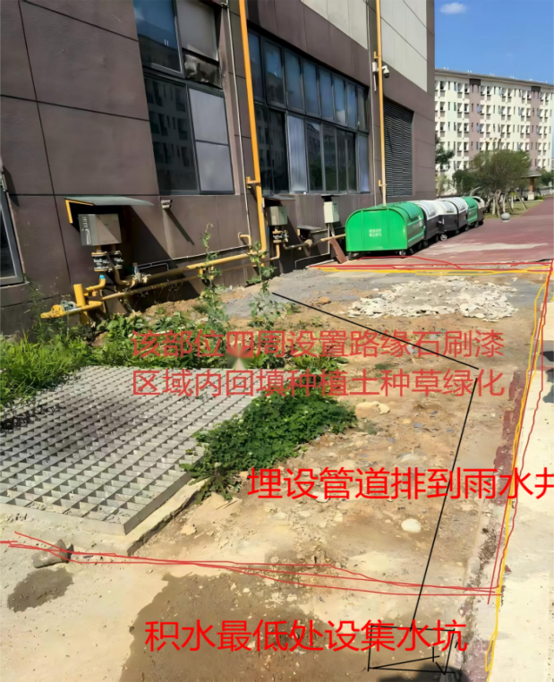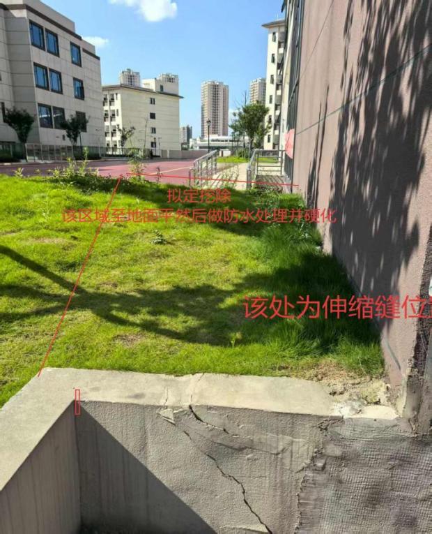 taptap点点二食堂西侧墙体与教学楼连廊部位为伸缩缝位置,该部位现状为绿化带,从这个位置会出现渗水到负一层,很难根治。为确保解决连廊部位负一层渗漏水问题,拟将该处绿化带挖除,设置防水层,墙角部位设置倒角,再用防渗混凝土硬化为人行通道(详见现场图片和具体施工方案)。二食堂南侧有一区域长期积水,并且现场有几个雨污水、消防井盖,显得杂乱不规整(详见现场图片),拟将该区用路缘石隔离出来,区域内回填种植土绿化,既起到美化效果又不影响区域功能,并将积水处设置集水坑加盖板,下埋设管道引流到雨水井中。