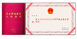 证书规格为245×170mm。封面选用大红色丝绸材料,烫金印制“事业单位集体记功证书”字样。内页为浅黄色,花边图案为卷草纹,硬卡纸。其中,左上部分为获奖集体名称(字体为大标宋简体,23号字),中间部分为受到何种奖励(字体为魏碑,44号字),右下部分为颁奖单位印章和日期(字体为大标宋,18号字)。