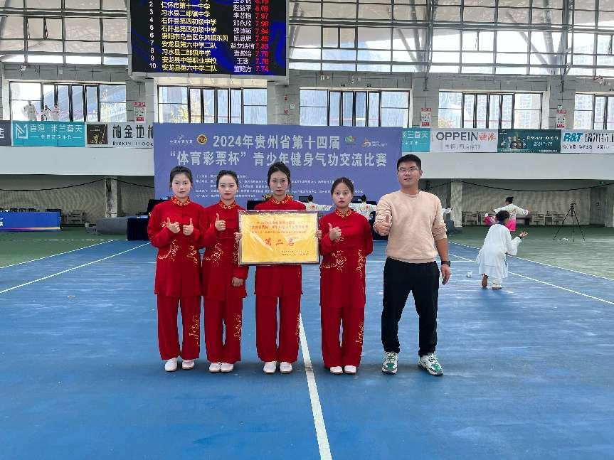 据悉,本次比赛共有来自来自全省74支参赛队伍430余人参加比赛。本次交流比赛分为易筋经普及功法、五禽戏普及功法、八段锦普及功法、马王堆普及功法、大舞普及功法、导引养生功普及功法、易筋经竞技功法、五禽戏竞技功法、八段锦竞技功法九个项目。赛场上,我校参赛8名学生和带队周天龙全神贯注的关注着比赛情况,运动员们身着宽松的服装,在赛场上静心凝神,随着裁判员的示意,缓缓地施展健身气功的各个招式,动作柔和而连贯,呼吸与动作协调一致,展现出内外兼修的意境。时而如行云流水,时而如风吹柳絮,运动员在赛场上显得从容不迫,将健身气功的内在修养和外在表现完美结合。本次比赛我校学生获得集体项目第二名1个、第五名1个;个人赛:第一名1个、第二名3个、第三名2个,第六名1个、第八名1个,最后获得团体总分第四名!此次比赛不仅是对选手们实力的考验,也促进了贵州省高校间的体育交流,为校园健身气功发展注入新的活力,更是进一步增强大学生对传统体育健身运动的了解和热爱,弘扬中华武术、传承中华文化、深化体教融合、促进体旅发展。