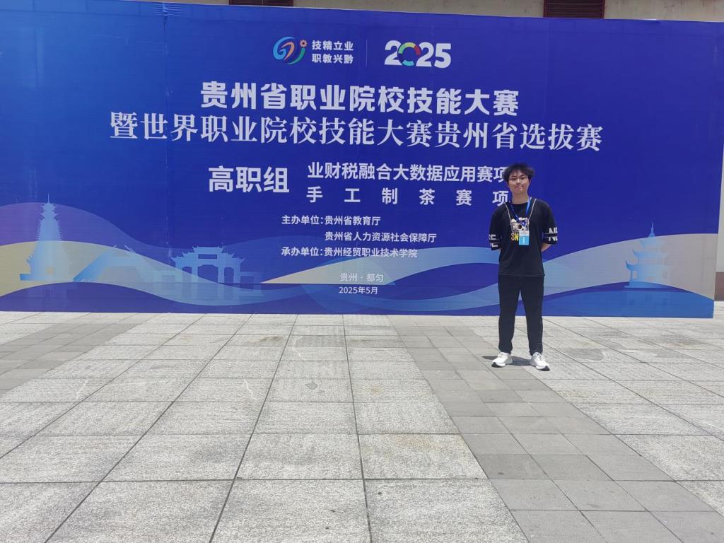 2025年5月7日-9日,我校家管专业2441班杨志伟同学,在体育与文旅学院刘宇老师指导下,参加了2025年贵州省职业技能大赛手工制茶赛。选手专注制茶,赛场秩序井然,最终获三等奖,为校添彩!